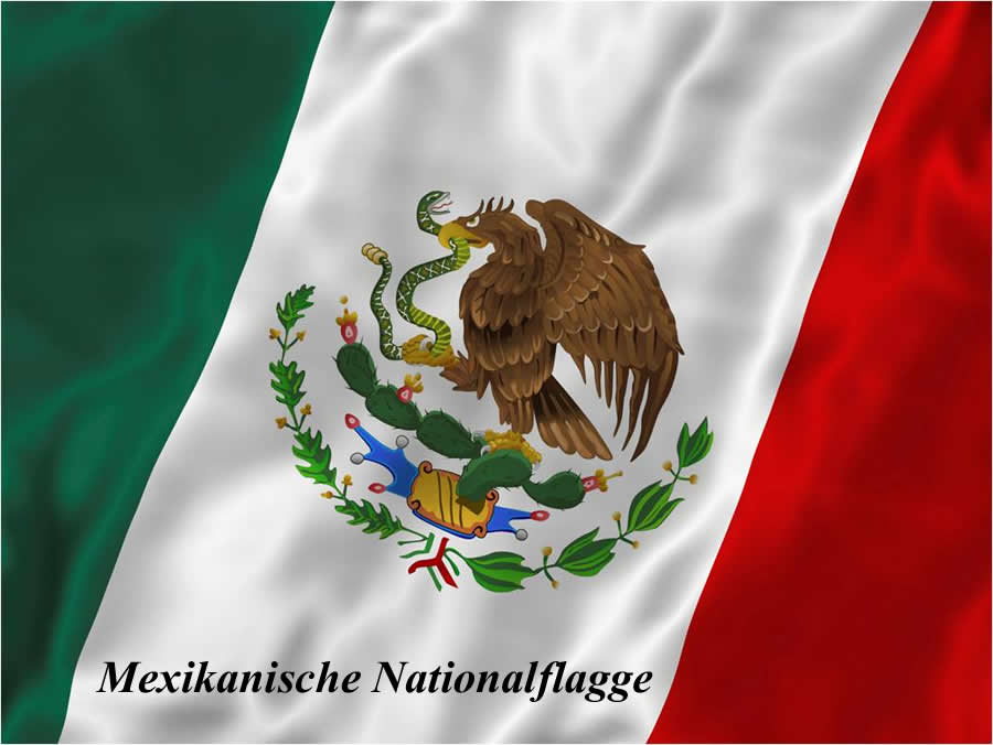 Die Nationalflagge Mexiko ist in den gleichen Farben wie die italienische Flagge gehalten. In der Mitte wird ein auf einem Kaktus sitzender Adler dargestellt. In der aztekischen Mythologie war dies ein Zeichen der Götter, das Volk sollte ihre Hauptstadt Tenochtitlán dort aufbauen, wo ein Adler eine Schlange verspeist. Zu Ehren dieses historischen Ereignisses, wird dies symbolisch auf der mexikanischen Flagge dargestellt.